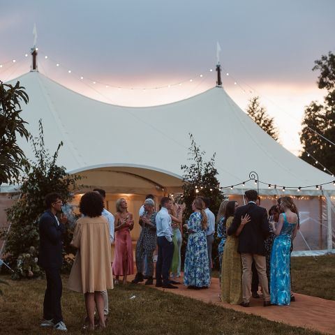 Stunning external flying festoons, unique to our marquees. Hung between the king poles on top of the tent to mirror the swooping silhouette